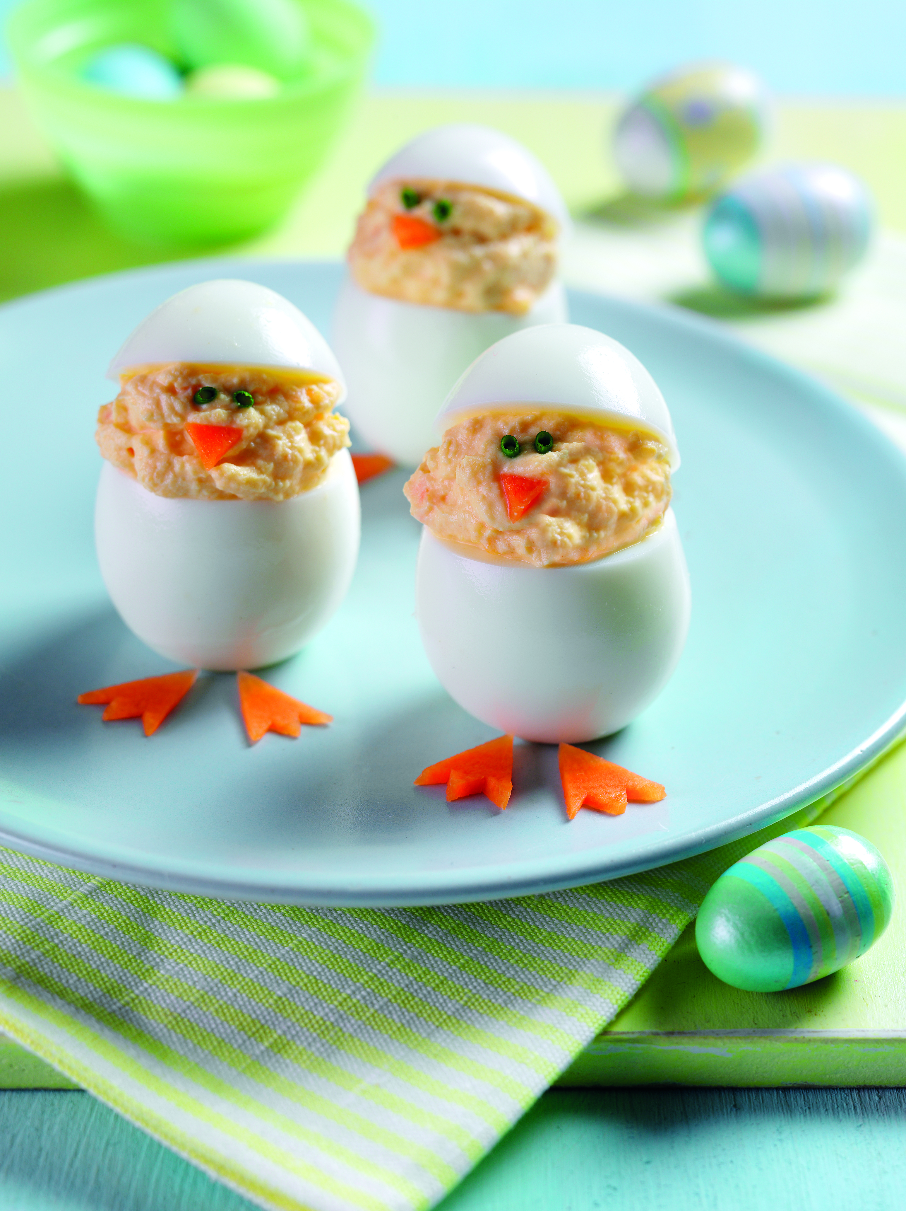 3. Add the egg ‘lids’ then add a beak made from a small triangle of carrot and eyes made from snipped chives. For the feet, cut the sliced carrot into triangles, then cut out smaller triangles from the rounded edge to make claws, and arrange these under the base of the egg.